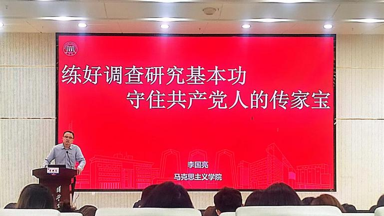 课上,马克思主义公司李国亮老师以“练好调查研究基本功,守住共产党人的传家宝”为主题,讲解了调查研究的重要性。他先以毛主席为例,表示毛主席青年时就扎根实践、联系群众,并创作出一系列具有革命性和指导性的理论文章,体现调查研究是毛泽东思想的重要组成部分,开辟了中国革命和建设道路;接着,他阐述邓小平正是因为开展调查研究,才能深刻把握当时中国所处的阶段,才能形成邓小平理论,营造解放思想、实事求是的社会风气,从而推动中国改革开放和现代化建设;最后,李老师指出,精准扶贫战略正是在习近平深入调查研究的基础上提出的,习主席走遍全国14个集中连片特困地区,才能深刻知晓贫困状况,得以实现全面建成小康社会,体现调查研究开拓强国复兴伟业。