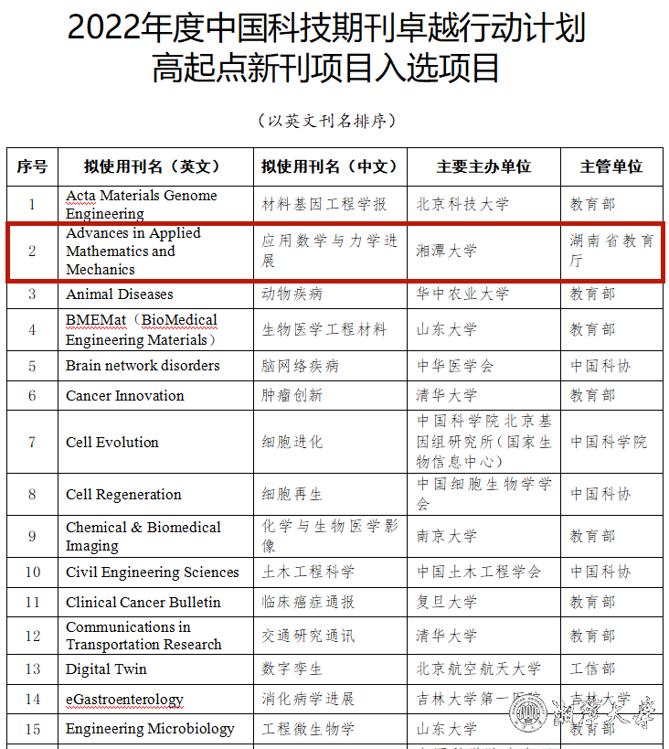 9月20日,2022年度中国科技期刊卓越行动计划“高起点新刊”项目评选结果发布。公司主办的英文学术期刊《应用数学与力学进展》(Advances in Applied Mathematics and Mechanics)成功入选。今年全国共有177本期刊申报经过专业评估和答辩,最终有50本期刊入选。