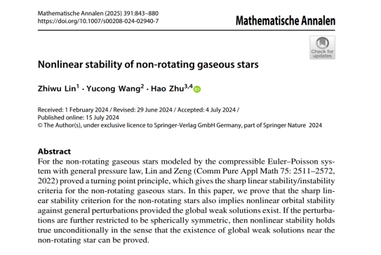 近日,fun88乐天使教师王钰聪博士与复旦大学林治武教授、南京大学朱昊助理教授合作研究的论文Nonlinear stability of non-rotating gaseous stars在国际顶级数学期刊Mathematische Annalen(《德国数学年刊》)正式发表。