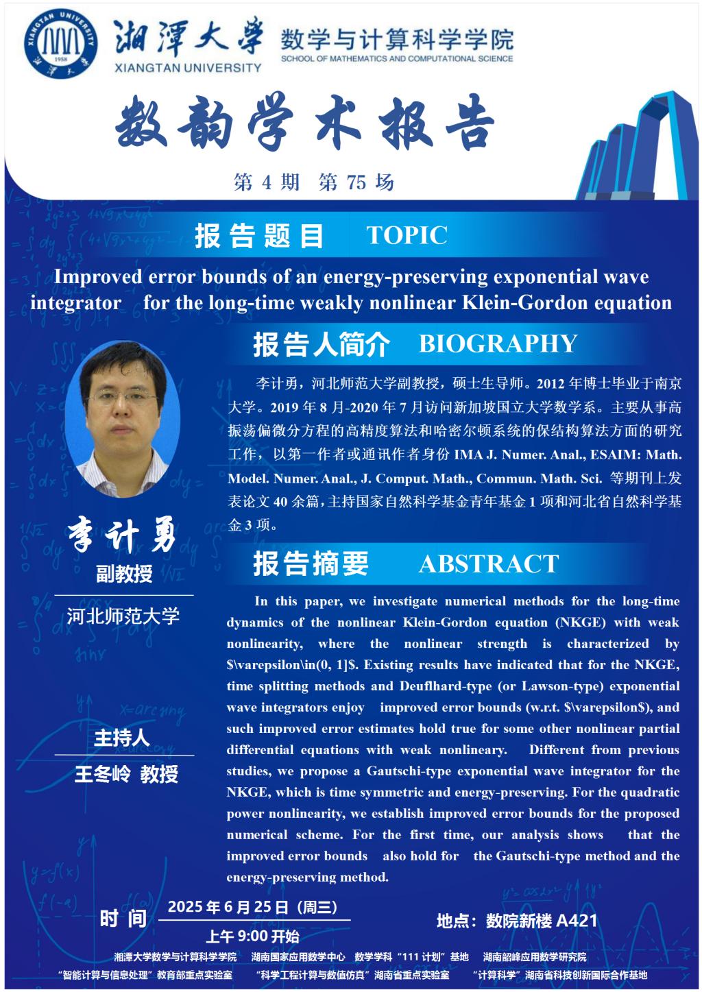 数韵学术报告-Improved error bounds of an energy-preserving exponential wave integrator for the long-time weakly nonlinear Klein-Gordon equation