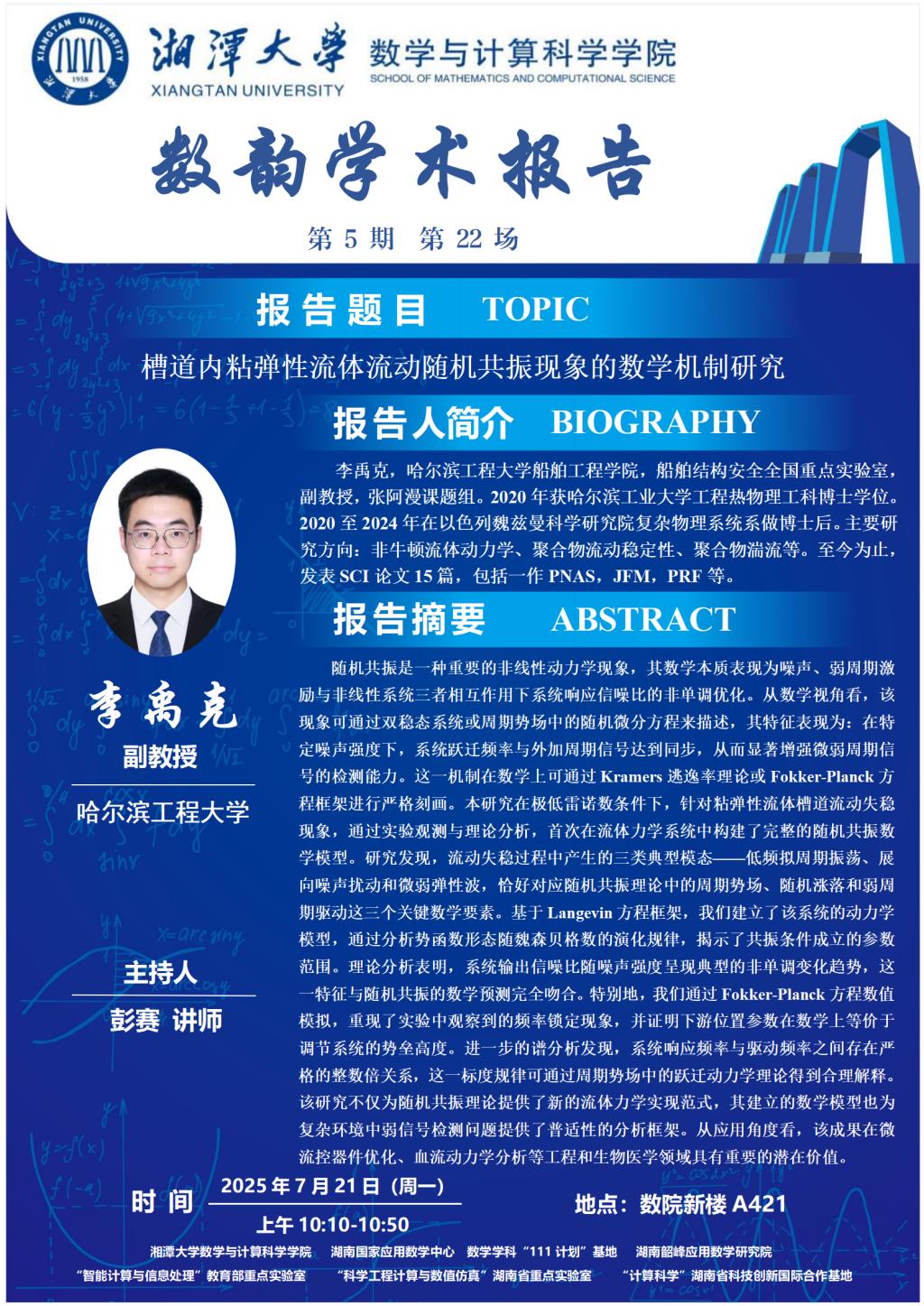 数韵学术报告-槽道内粘弹性流体流动随机共振现象的数学机制研究